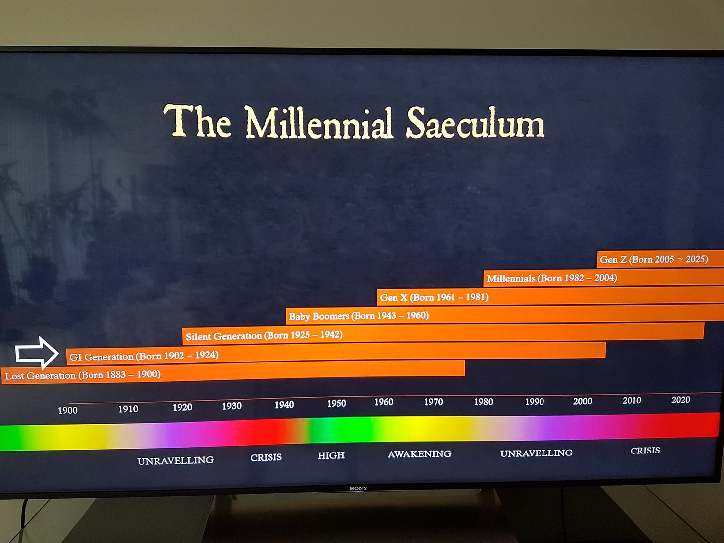 Each generation falls into one of four archetypes which recur over and over, and each "saeculum" is about the length of a human lifetime, around 85 years: