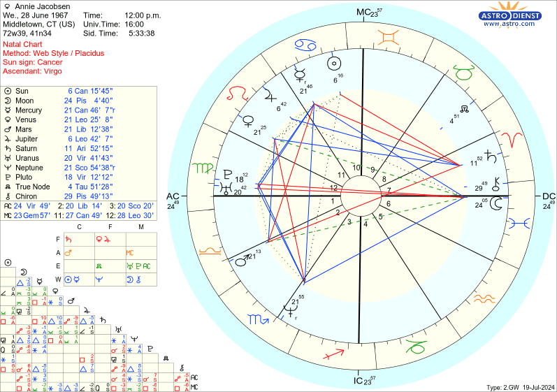 Annie Jacobson was born in Middletown, Connecticut USA on June 28, 1967. We don't have her birth time so I've cast a noon chart which gives a rising sign of 24° Virgo and puts her Pluto-Uranus conjunction very close to the ascendant. In this chart the Moon and Chiron are very nearly conjunct the descendant at 24° Pisces but we're not going to consider anything to do with the ascendant, descendant or house placements because those are completely dependent on an accurate birth time.