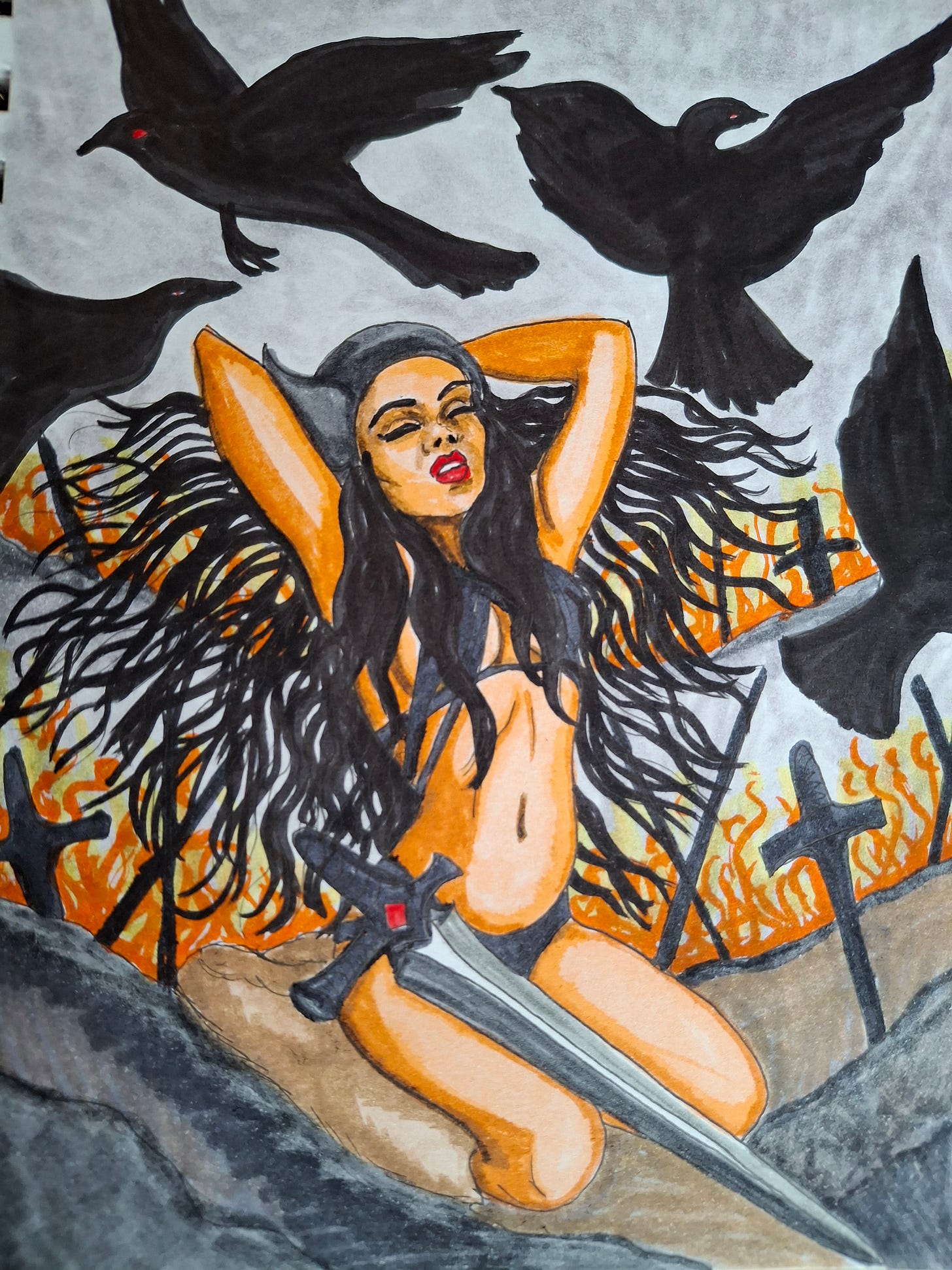 In her shapeshifting capacity, the Morrígan can take the form of a beautiful young woman, various animals, or warriors on the field of combat, but most often she appears as a crow, surveying the battle from above and predicting the violent deaths of her enemies.