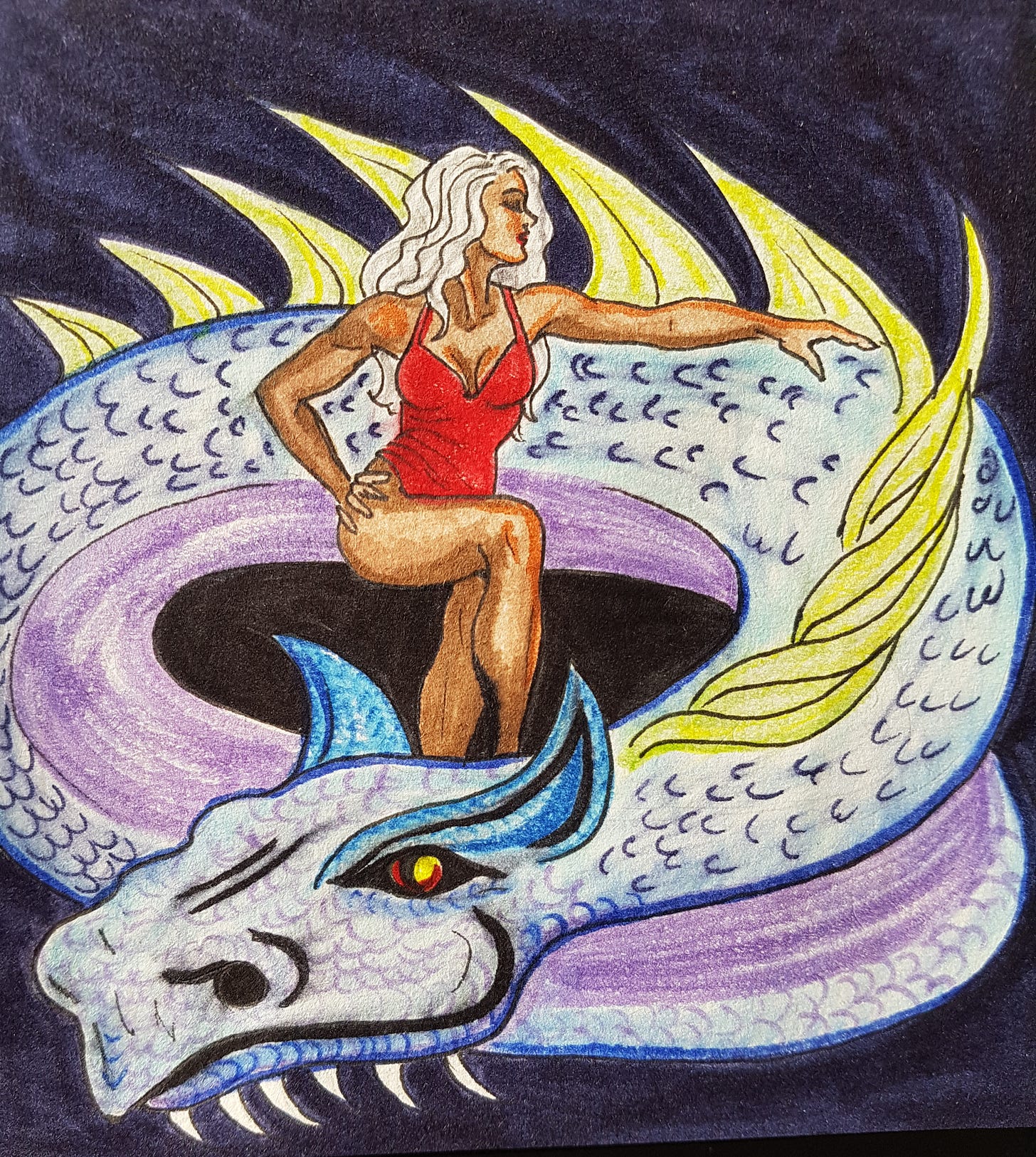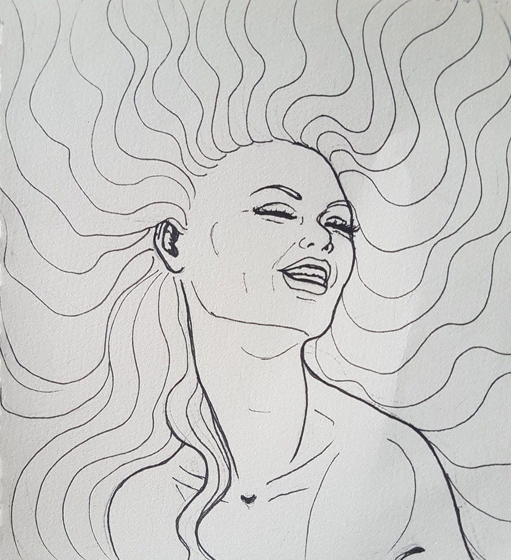 This one was all done with ink, no pencils, and the hair is a combination of colored pens and orange and yellow highlighters, which reminds me of a story that may seem unrelated but bear with me…
