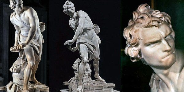 Bernini's David is so dynamic and hyper-masculine, it makes Michelangelo's David look like Donatello's.