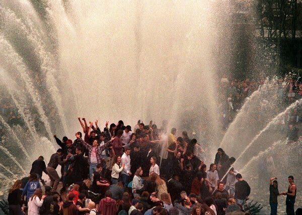 The day after the memorial, both of the city papers carried the story on the front page. I saw them as I was walking down Queen Anne Hill to work; the Seattle Times had a photo of a bunch of kids in shredded jeans and flannel shirts splashing around in the fountain. Beside it was the inconsonant headline: "Fountain of teen spirit for Kurt Cobain."
