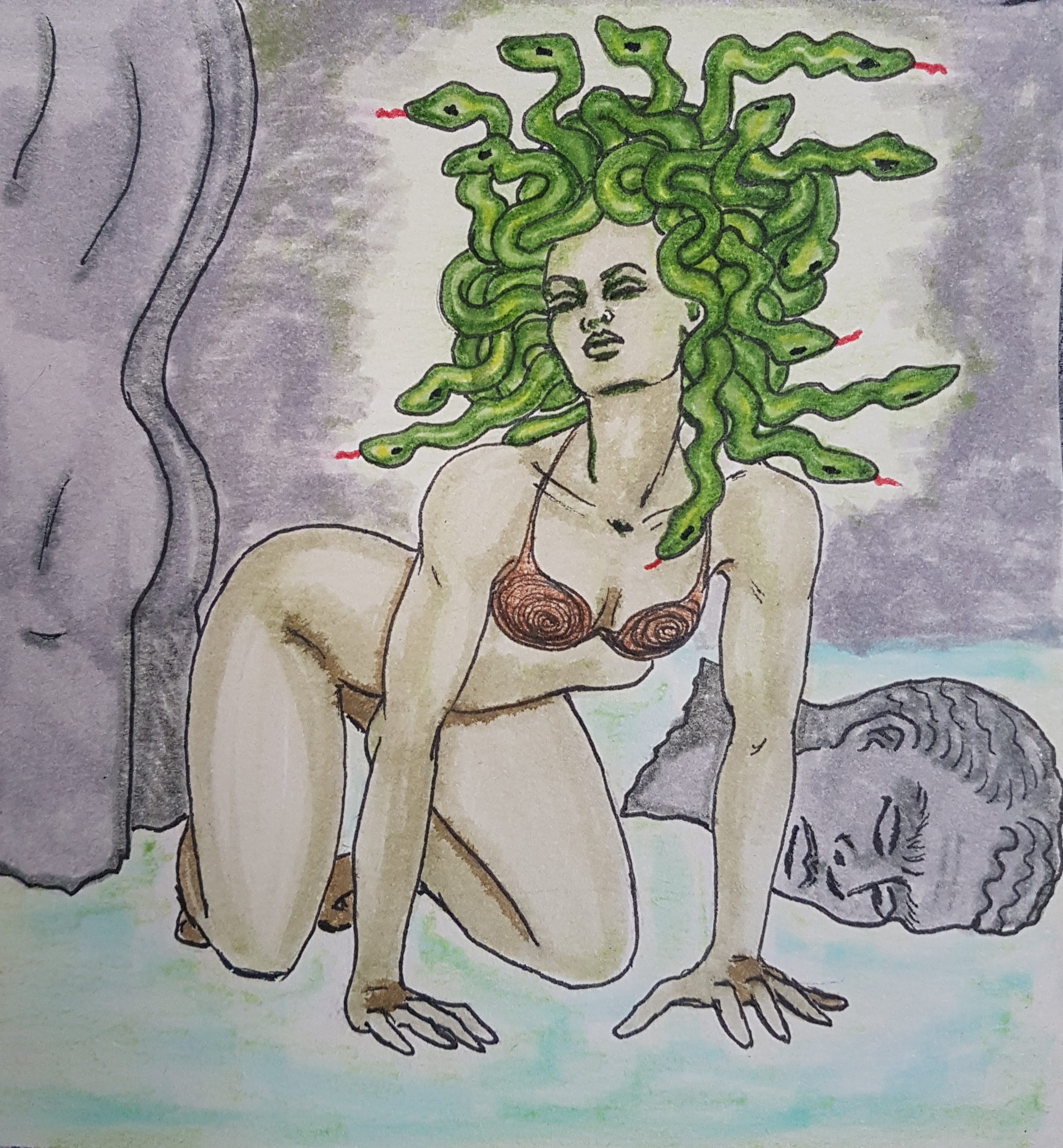 She was seduced by the sea god Poseidon in a temple of Athena, who punished the sacrilege by turning Medusa’s long hair into writhing snakes, the very sight of which turned men to stone.