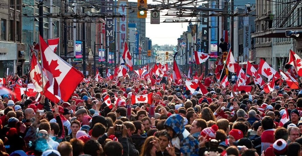 We stepped out onto the balcony and saw half the residents of the building across the street standing out on their balconies. They were screaming, hugging, jumping up and down, waving at cars, waving at us and each other and, of course, waving Canadian flags. Apparently everyone in the city now owned one.