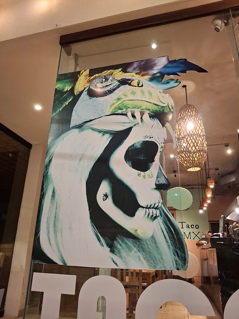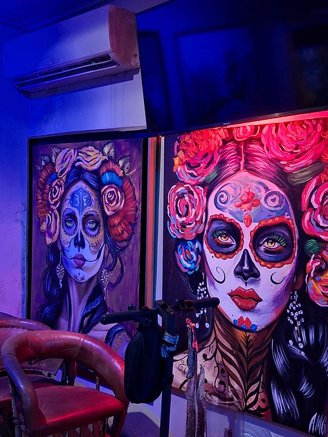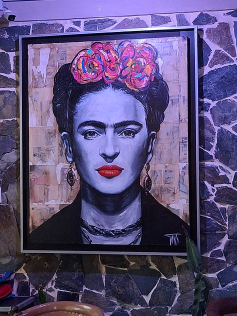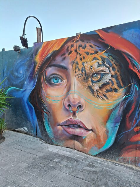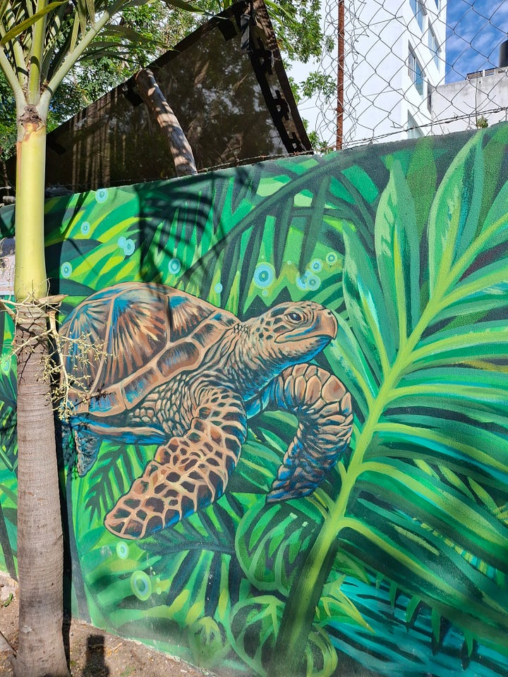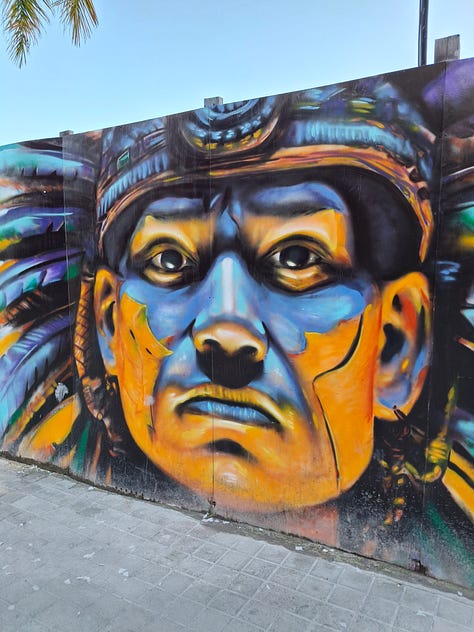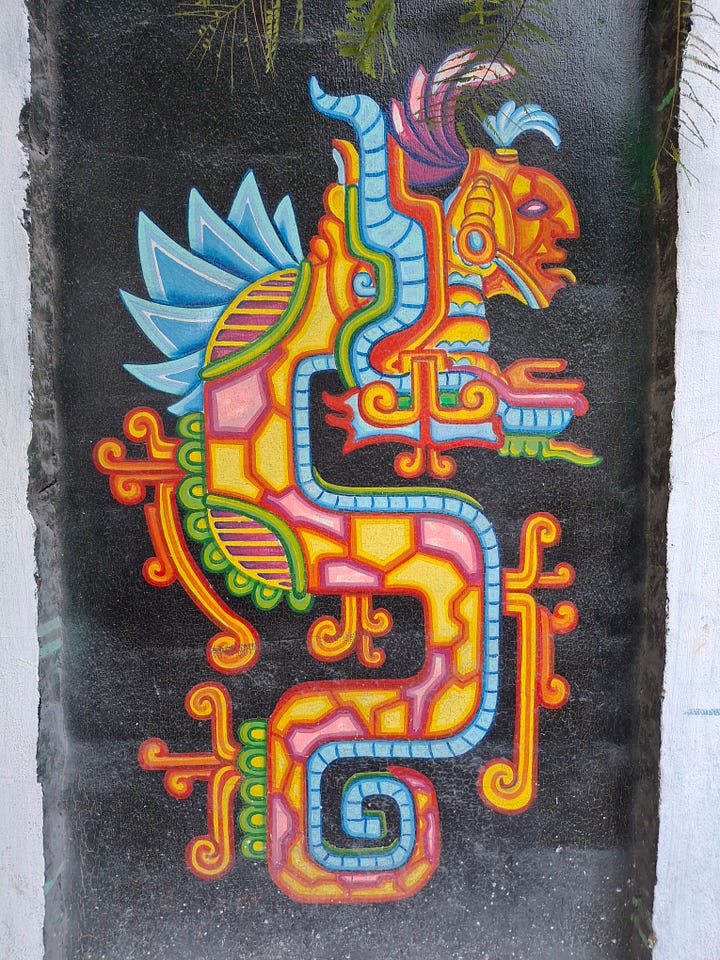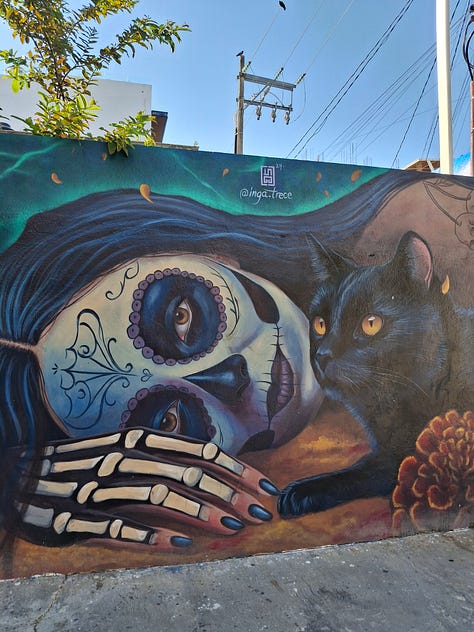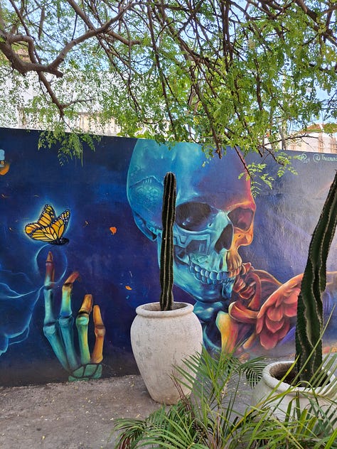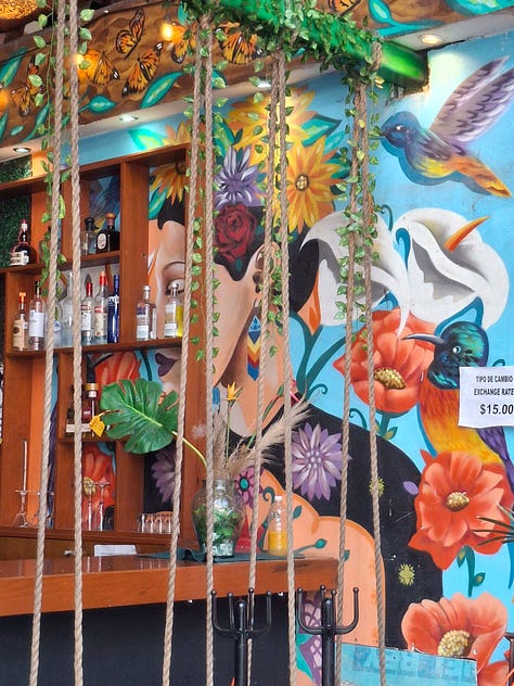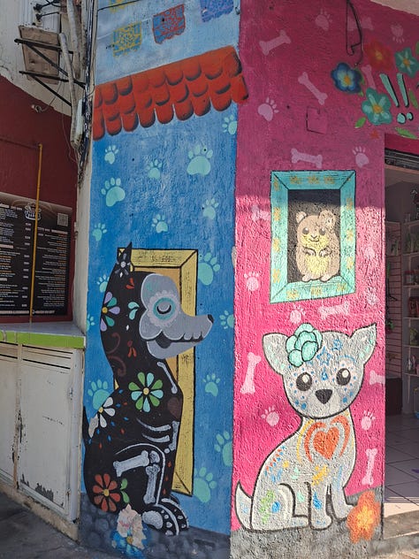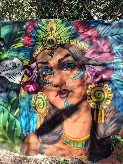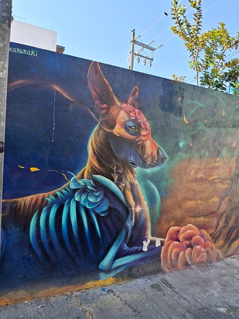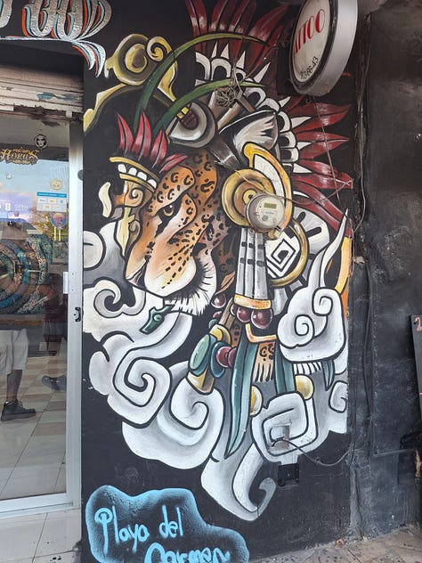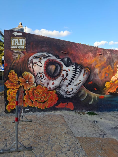 Some of the main themes of the mural art we saw in Playa del Carmen were Mayan history, Mexican folk heroes like Frida Kahlo, and art that celebrates the blending of life and death (sugar skulls, mystical animals, etc.). There is also a collective style called Pinta o Muere that transforms damaged spaces into artistic, colorful murals.