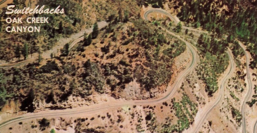 In one particularly hellish episode, as we descended into the Oak Creek Canyon on Highway 89A, my grandmother was standing up, leaning into the steering wheel to force her full weight onto the manual brake pedal, swearing and gritting her teeth, jumping up and down.