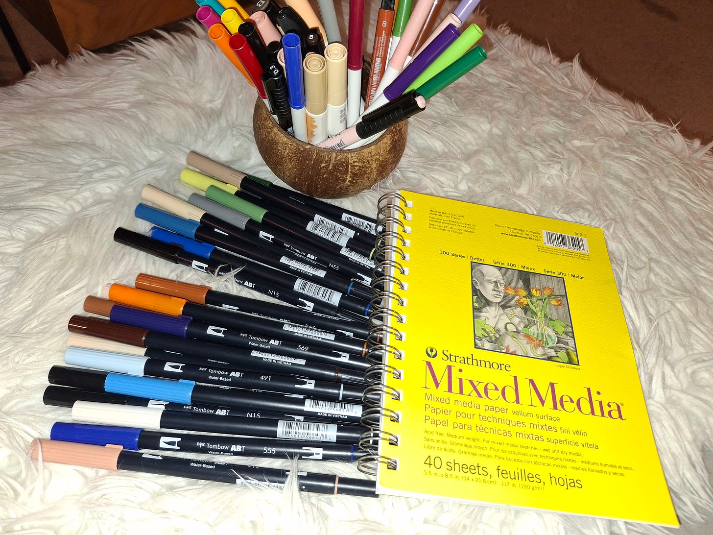 I picked up several shades of blue, green, grey and orange to supplement my collection of mostly skin tones and neutrals. I also picked up a few more fine lined black pens for inking the initial drawings.