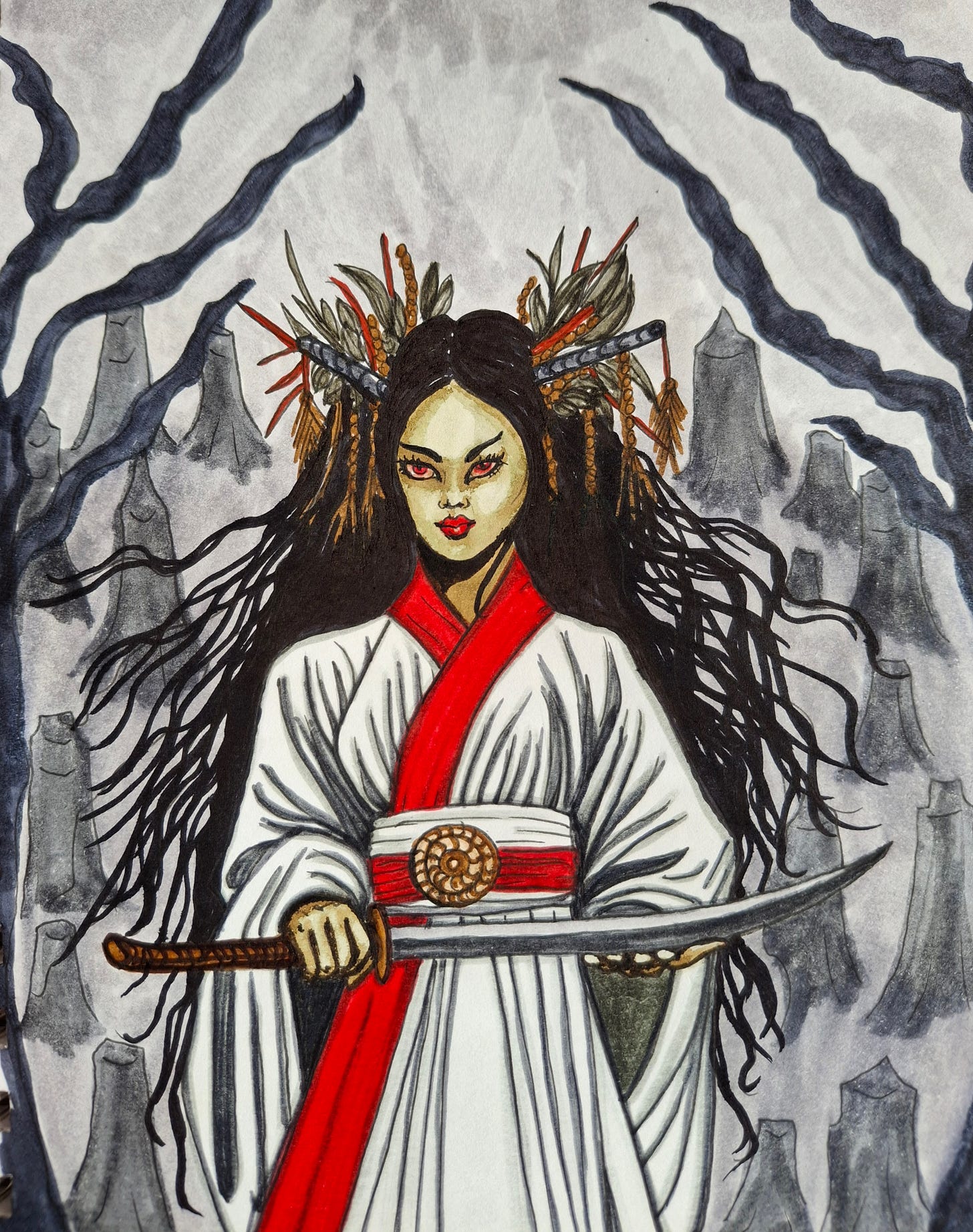 Izanami is a primordial Shinto creator and mother goddess. After dying in childbirth, she became the goddess of the land of the dead and ruler of Yomi, Japan’s underworld.