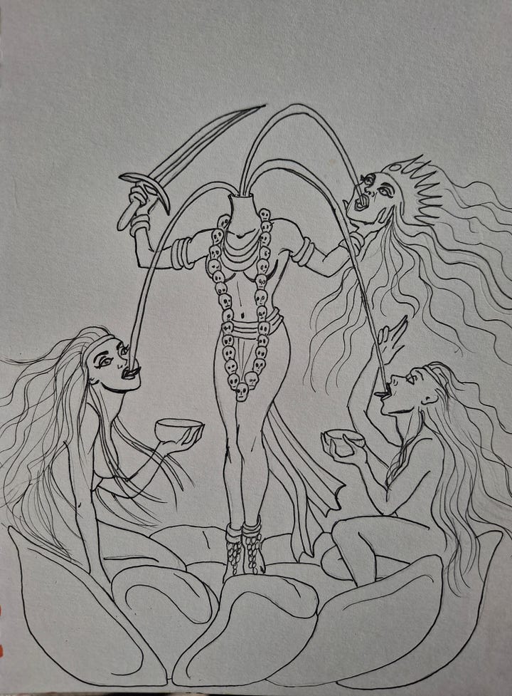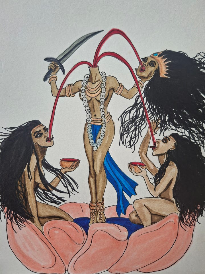 I know what you’re thinking, but hear me out on this one! The iconography associated with Chinnamasta is among the most out there I’ve encountered in all the badass goddesses I’ve drawn over the years. Let’s unpack the myth behind the bloodbath…