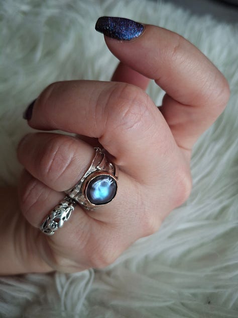 We agreed that the workshop that appealed to both of us was a “bezel set pearl ring” course offered by instructor Kelly Allenson. It took place on a Saturday starting around 10:30 and ending around 5:00 p.m. with a 45 minute break for lunch. This image was the inspiration: