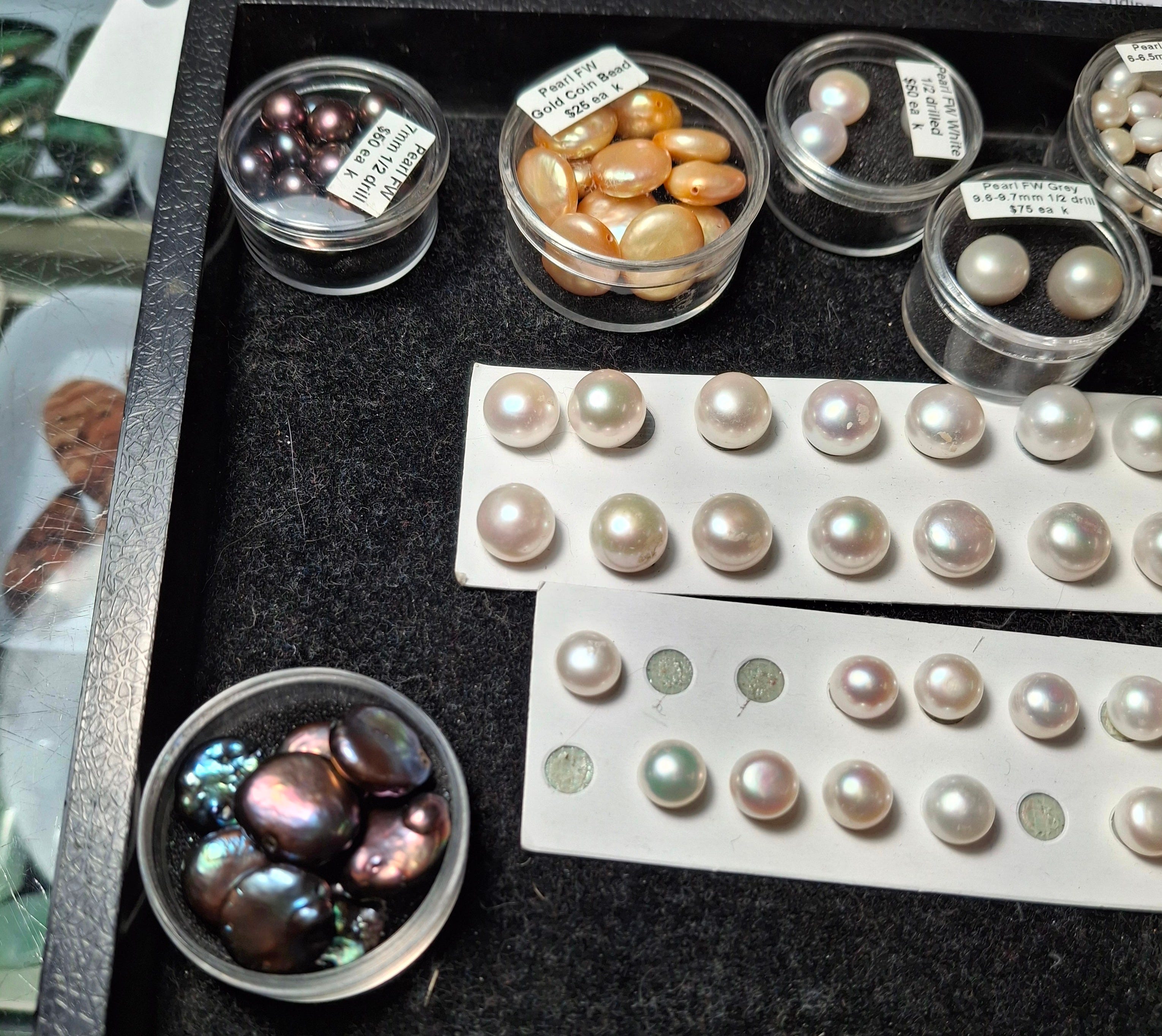 We both gravitated to the black pearls and furthermore the large flat disc style versus small and round. The instructor asked if either of us had experience working with metals and solder, and we said no.