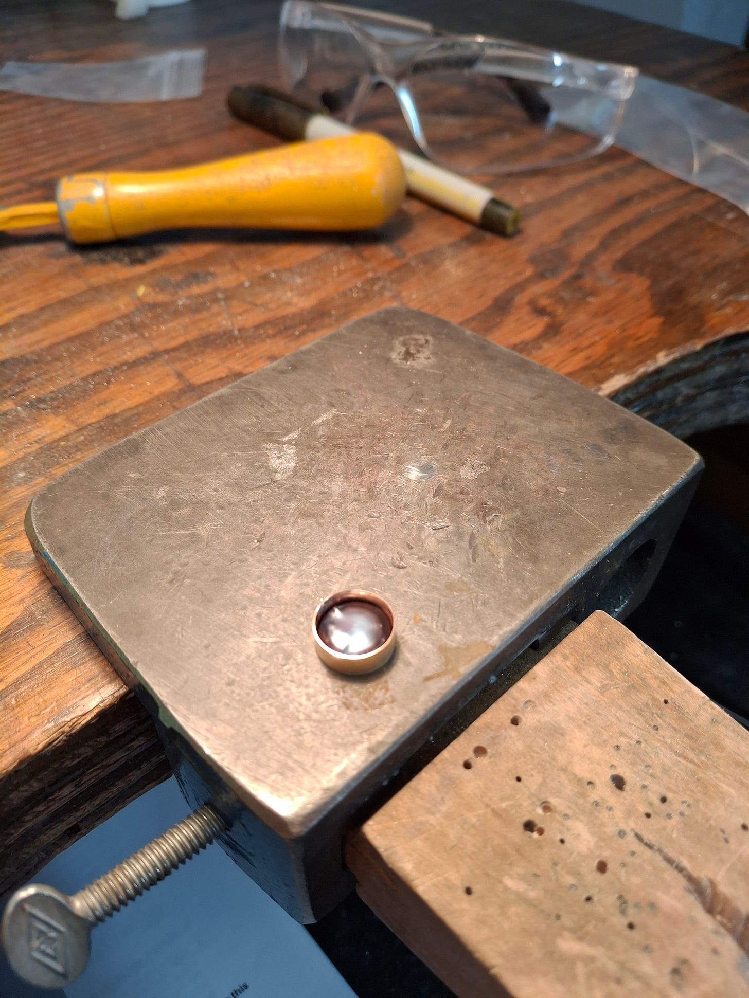 For the very last step, we carefully fitted our pearls down into the gold bezel and used a flat metal tool to press the edges of the bezel down to hold it in place, working very slowly so as not to scratch the pearl.