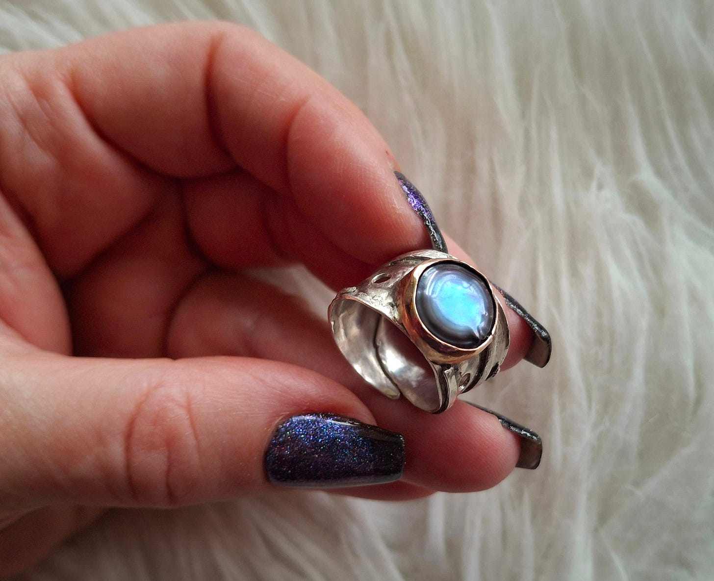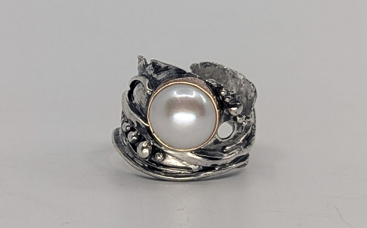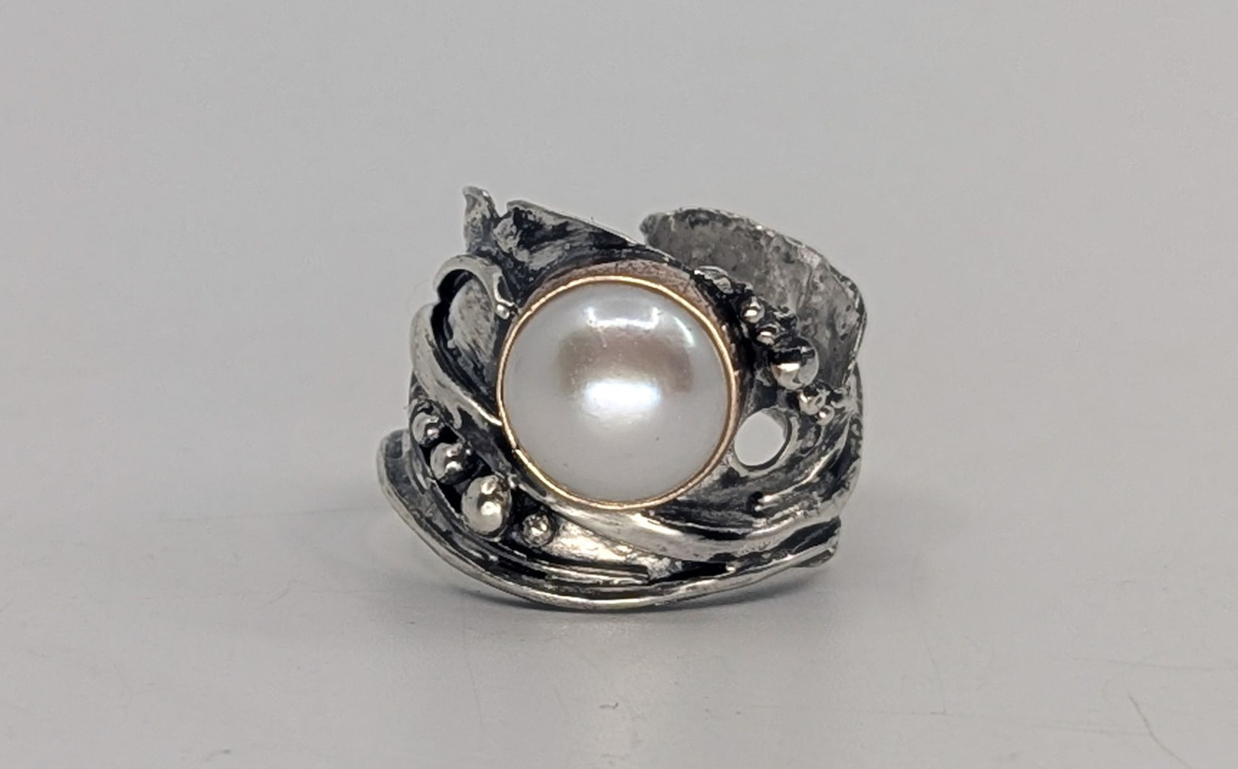 The next step was to optionally add tiny balls of silver to the design, or drill small holes in the band to create more texture, or both. Since my design already had a giant flat pearl in the middle, I decided to just add a few holes and skip the balls of silver.