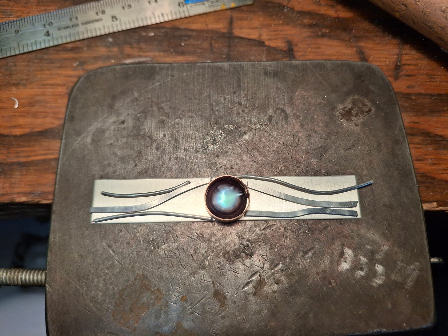 Next came the gold bezel, which needed to be filed to create a curve so it could be soldered onto the band securely. This is where the added challenge of choosing a large flat pearl versus a small, round one came into play. A smaller bezel would be much easier to seat on the band, but I was up to the challenge…