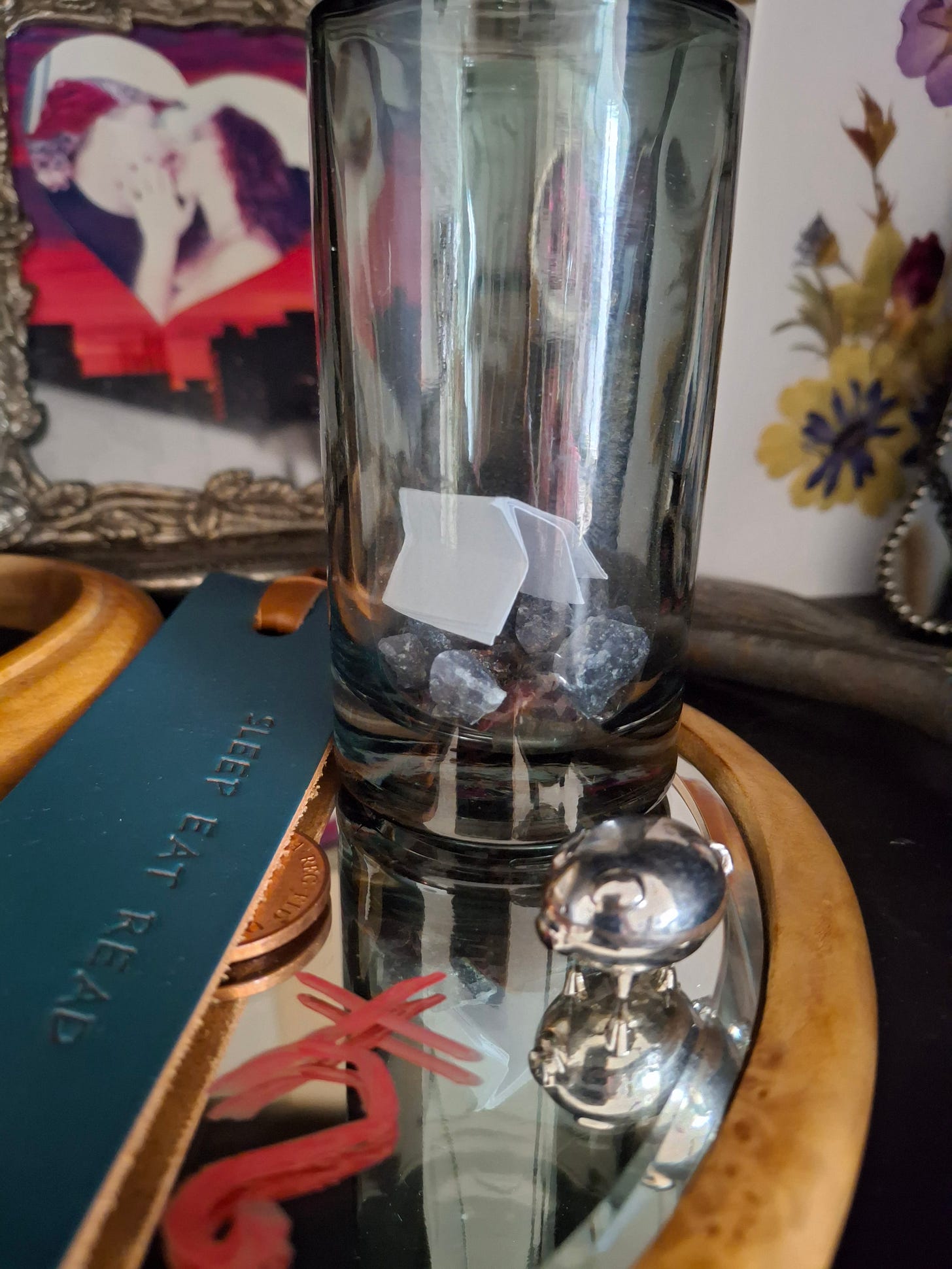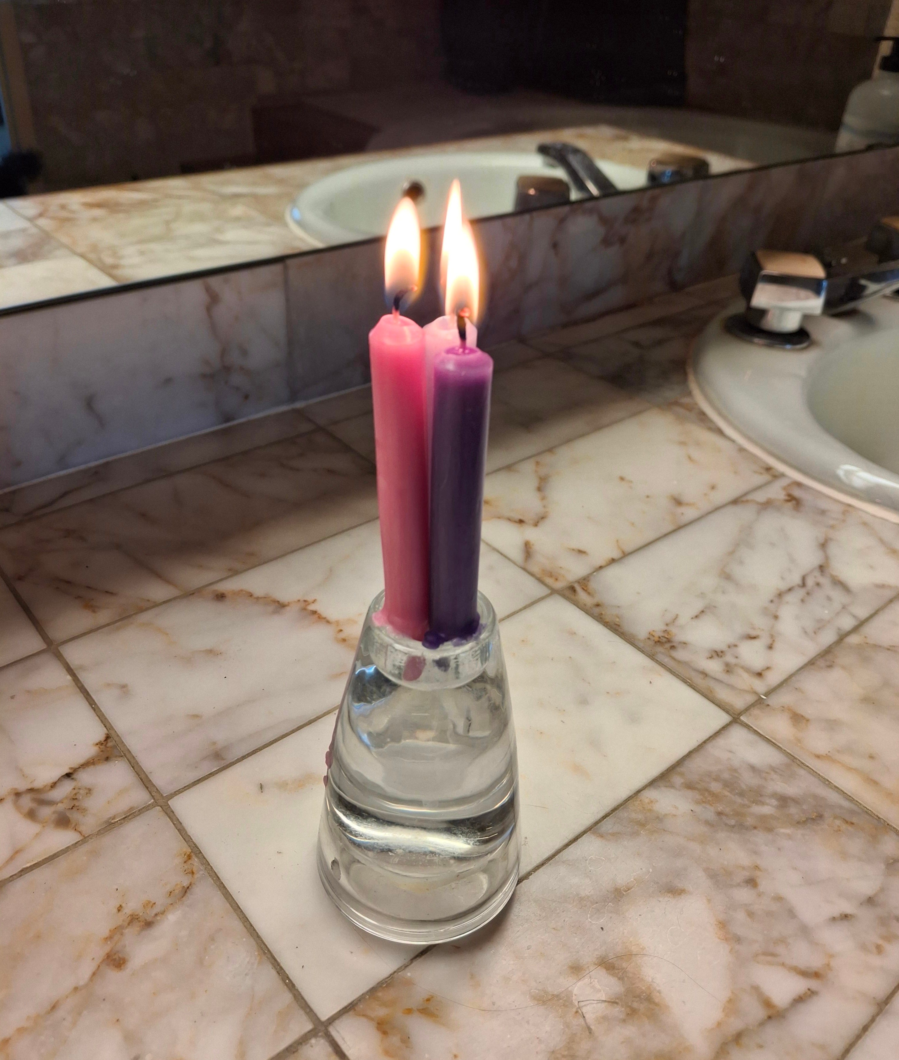 I funnelled the smashed rocks into the glass bottle and placed it on the mirror, then searched for a candle holder that would fit the three candles. I had to shave down the sides to make them fit, then I lit them on the bathroom counter and left them to burn all the way down.