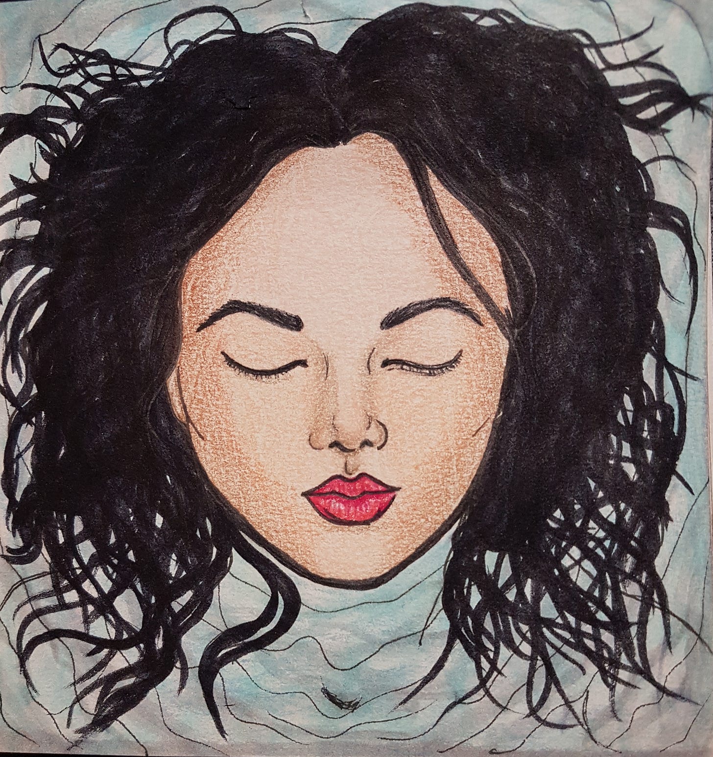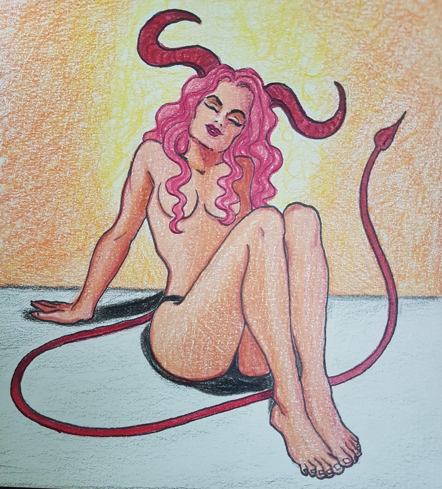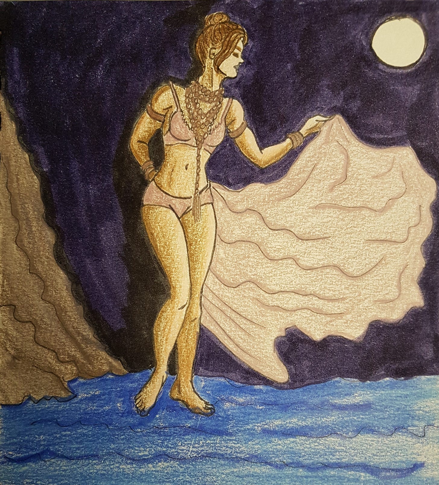 Tuesday’s drawing was inspired by another burlesque show I did last spring, dancing to The Doors’ “Waiting for the Sun.” We dressed as sunbeams personified, in shades of gold with shimmering veils. In keeping with the winter vibe, I reimagined it as an homage to the moon.
