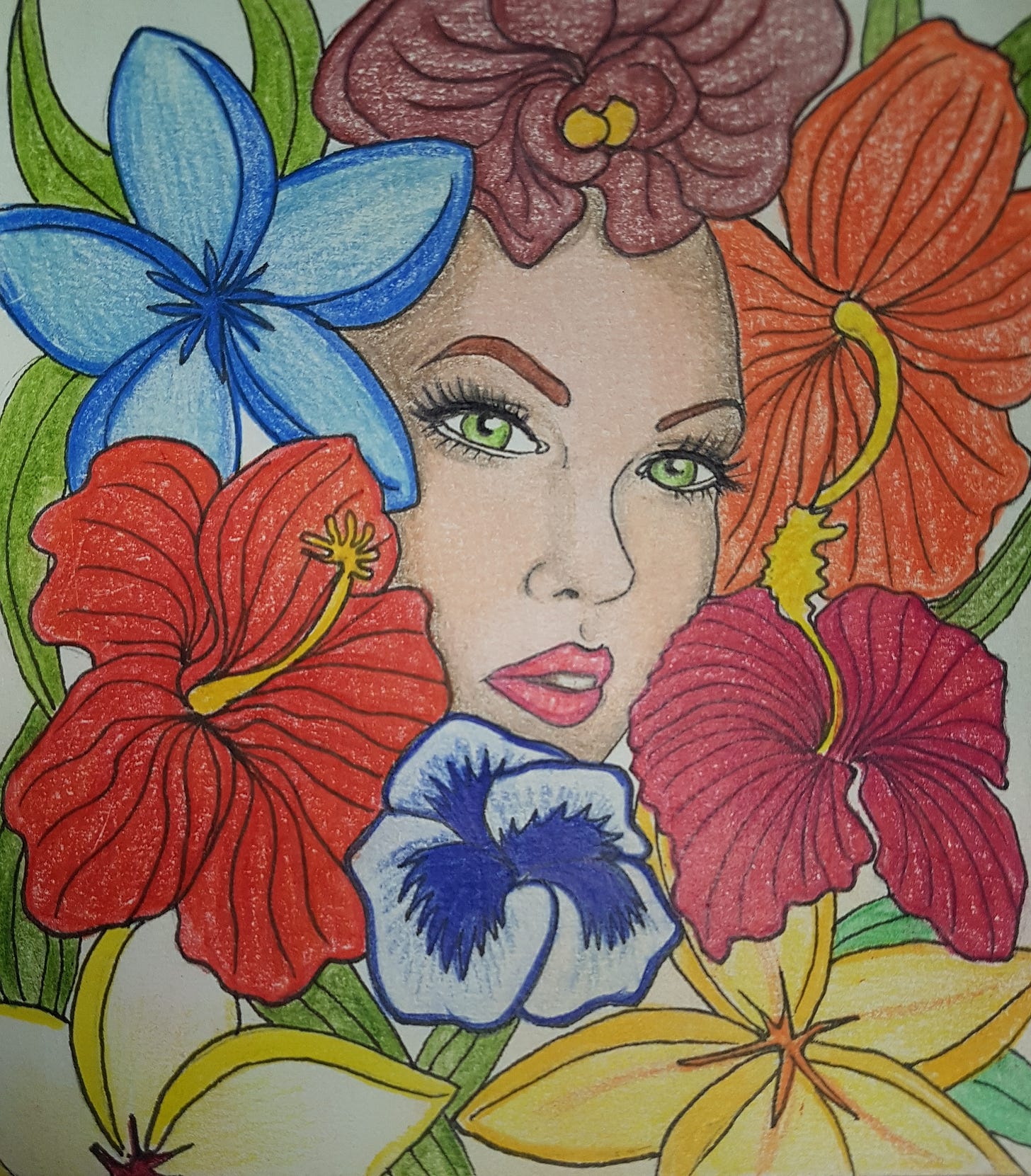 This is a bit of a different, decidedly tropical, take on the Celtic myth of Blodeuwedd, or Flower Face. I’ve drawn and written about her at length before… not to mention designing and crafting an entire costume, complete with cape and mask, and sending my mother down the runway as my model.